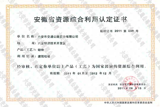 安徽省資源綜合利用認(rèn)定證書